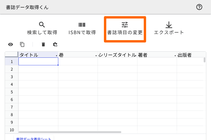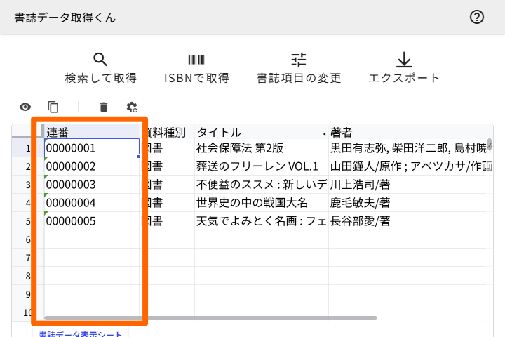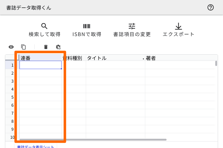 次に、「書誌データ表示シート」で「連番」列を表示します。「書誌データ表示シート」は、メイン画面にある表形式のシートのことです。