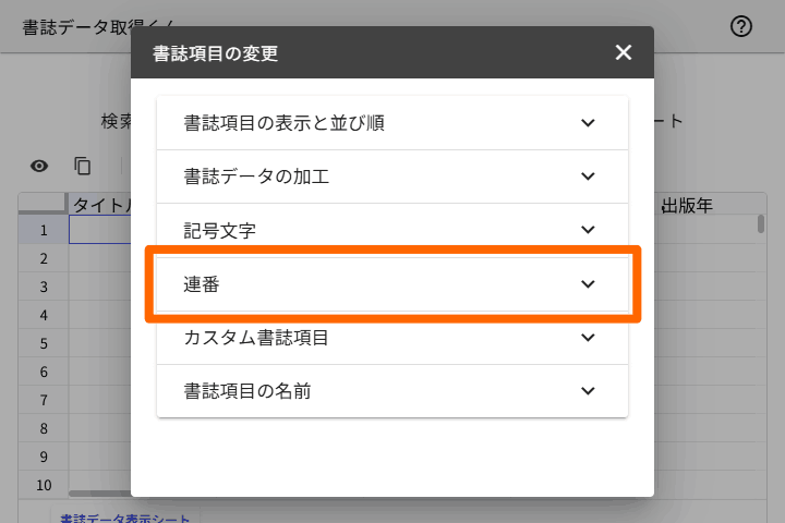 - 「書誌データ表示シート」で「連番」列を表示する