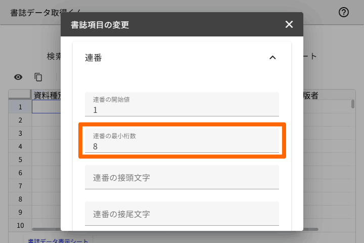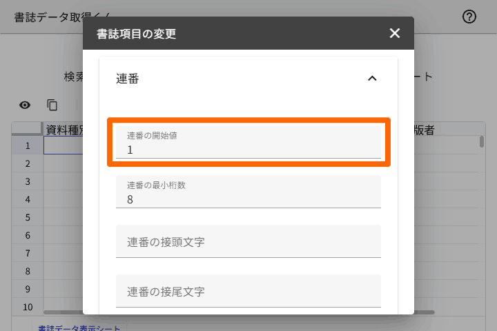 次に、開いたセクションで、「連番の開始値」を設定します。ここで設定した数字を起点にして、書誌データ取得時に連番が自動入力されます。