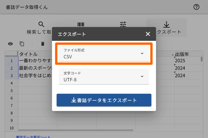 次に、表示されたメニューで、「ファイル形式」からエクスポートする書誌データのファイル形式を選択します。初期状態では「CSV」になっていますが、必要に応じて「TSV」や「XLSX (Excelファイル)」も選択できます。