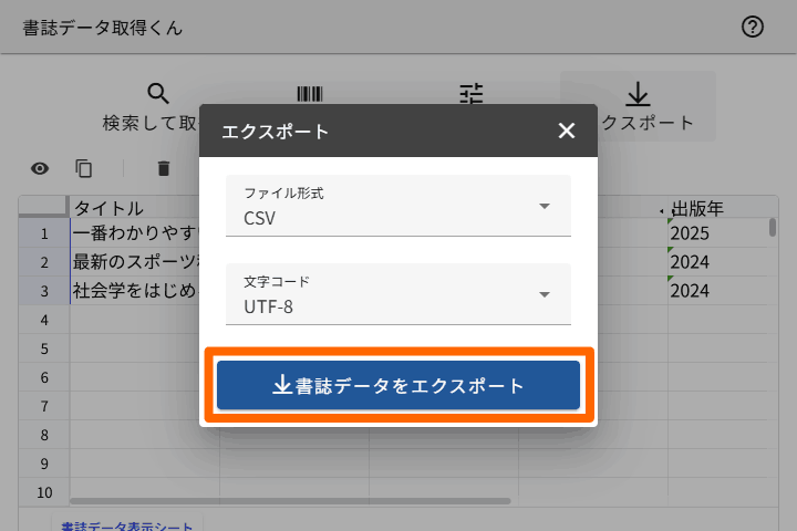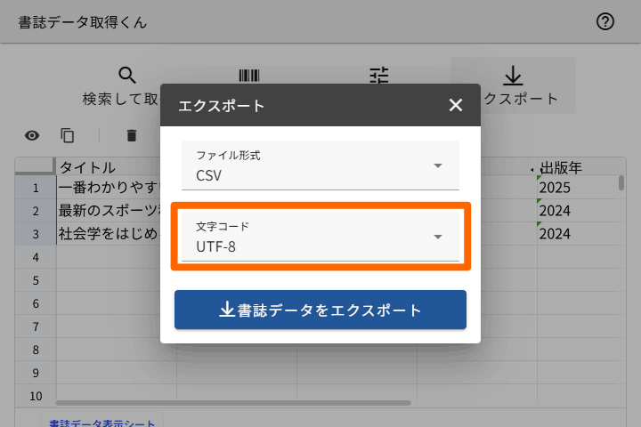 「書誌データ取得くん」では、CSVとTSVをエクスポートするときの文字コードを、「UTF-8」と「Shift-JIS」の2つから選べます。通常は、「UTF-8」を選んでください。「Shift-JIS」を選ぶと、エクスポートした書誌データの一部の文字が、正常に表示されない場合があります。